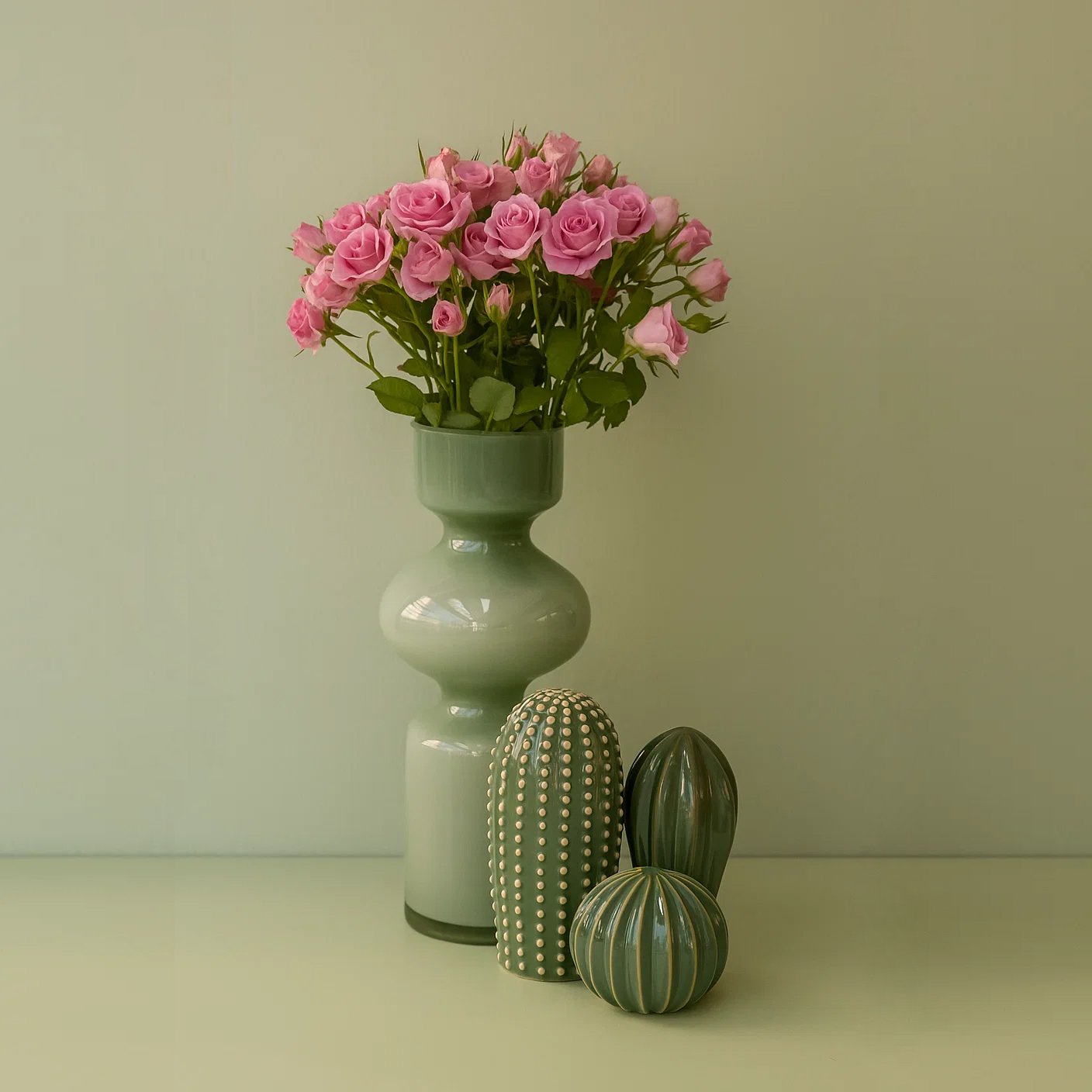 Embrace understated elegance with our captivating “Fresh Blush Bloom Vase” from The Bunch Box. This exquisite offering combines 5 lush stems of enchanting Pink Spray Roses, known for their clusters of soft, delicate blooms, with a distinctive Själsigt green decorative set (Set of 3). These charming decorative accents add a unique touch of modern design, perfectly complementing the fresh floral beauty.